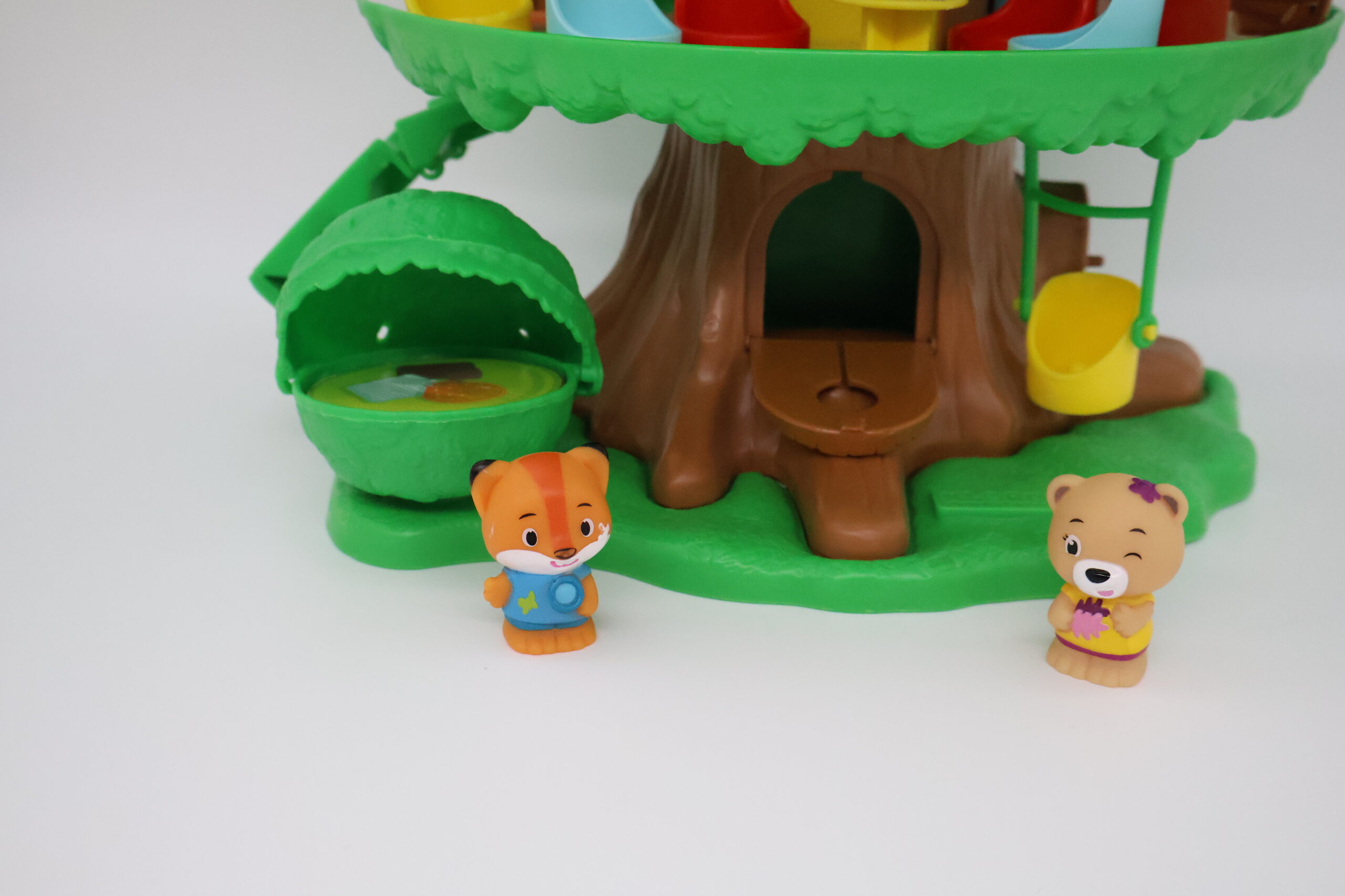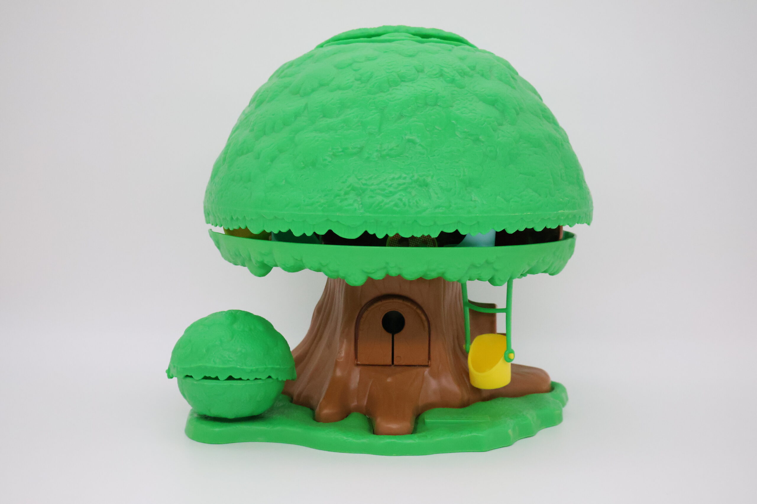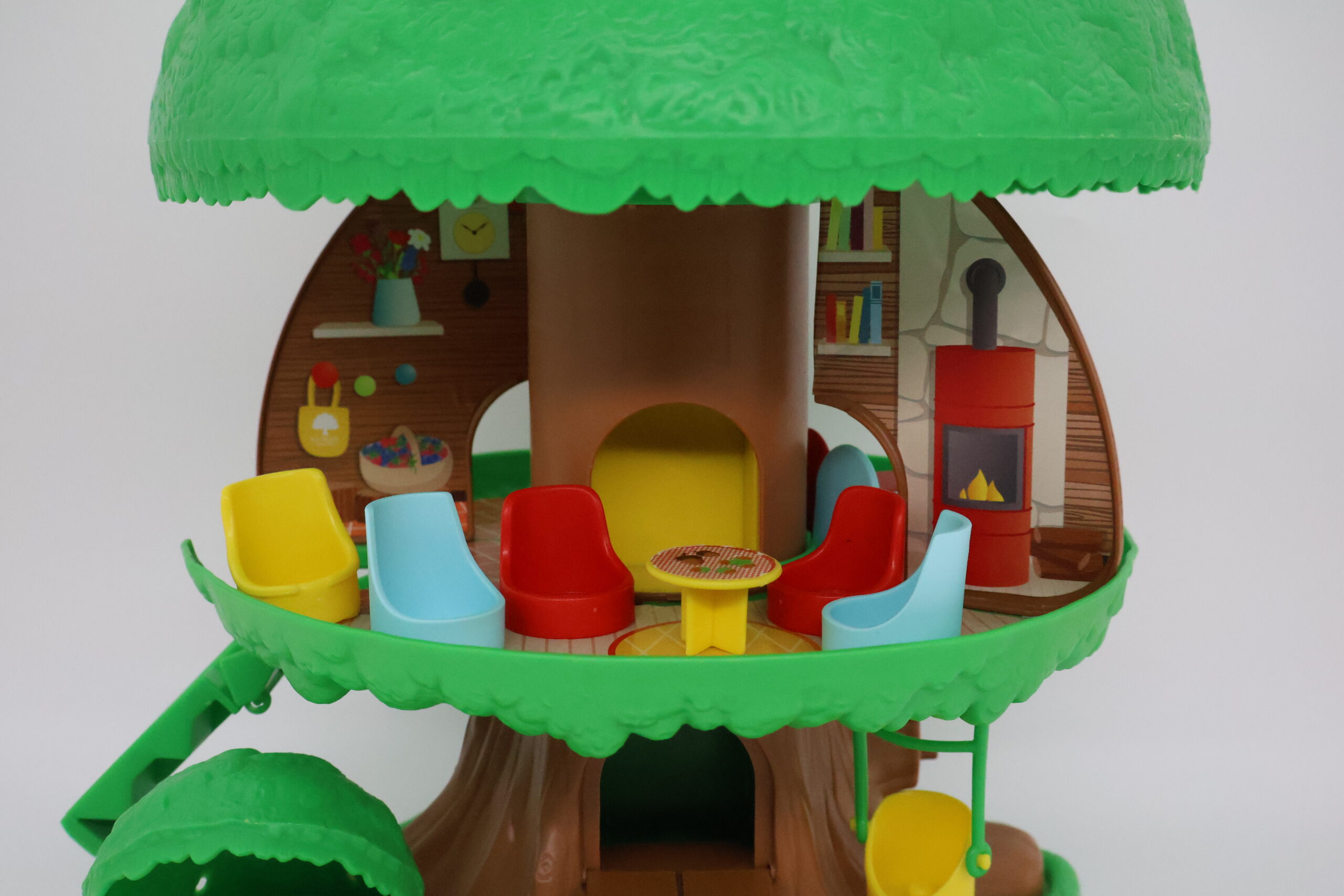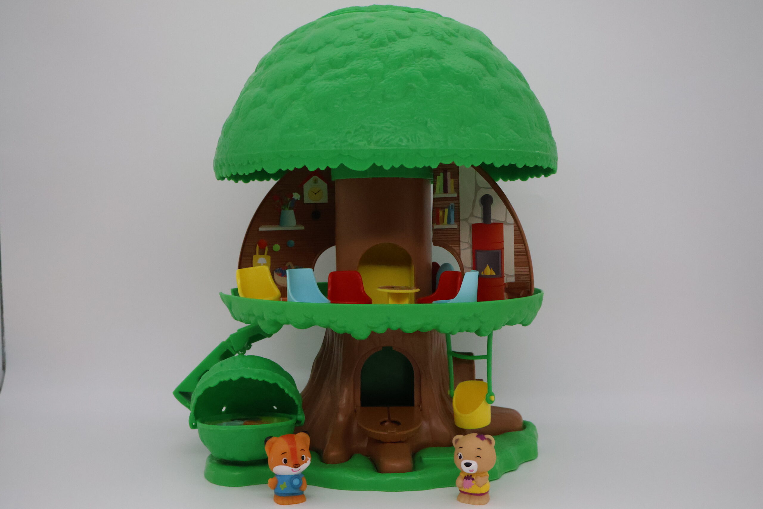 Appuie sur le toit et » Pop ! « , l’arbre dévoile tous ses secrets en s’ouvrant : une chambre, une salle de bain, une cuisine, un salon et même un garage! De nombreuses activités à découvrir, pour mettre en scène les personnages de la forêt magique : une manivelle pour faire monter et descendre l’ascenseur, un buisson avec un espace repos caché à l’intérieur, une voiture, une balançoire… Tout pour se raconter plein d’histoires et jouer à plusieurs !
