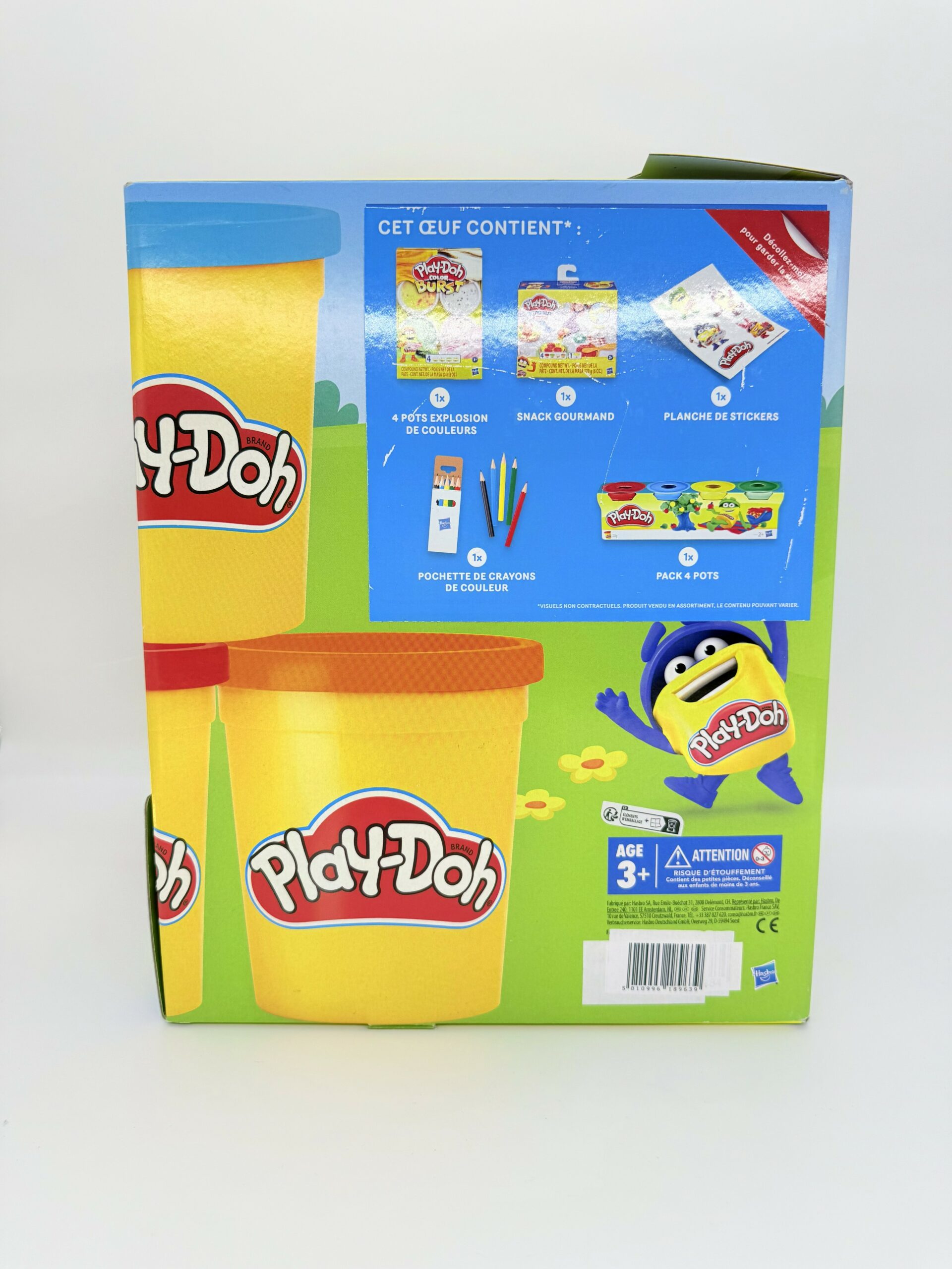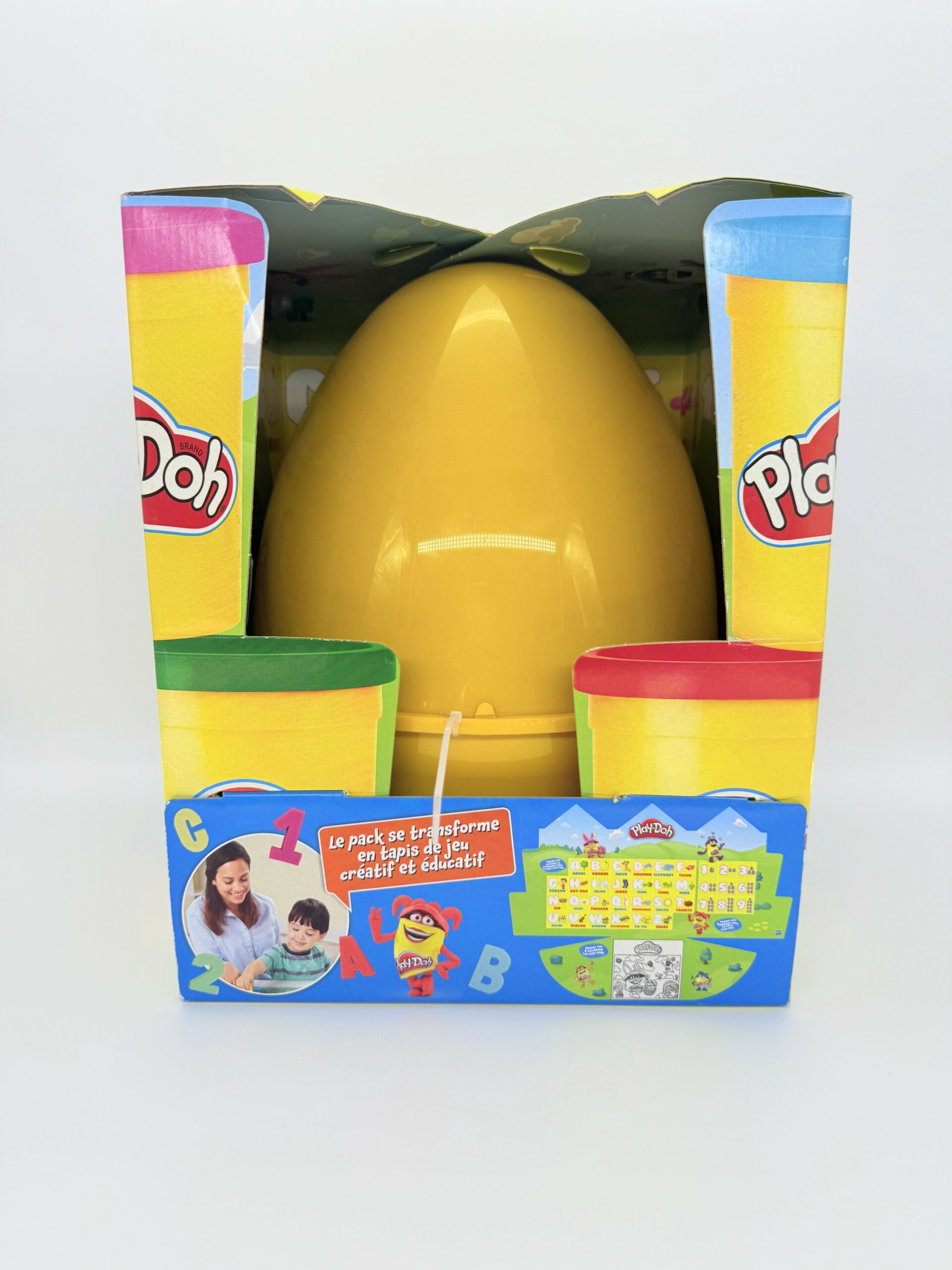 Les enfants pourront s’amuser et laisser libre cours à leur imagination avec l’œuf de Pâques Play-Doh ! La boîte se transforme en tapis de jeu éducatif et créatif. Ils peuvent aussi modeler les chiffres et les lettres et colorier les adorables Doh-Dohs. À l’intérieur, ils trouveront de nombreuses surprises comme les pots de pâte à modeler emblématiques, des emporte-pièces, extrudeurs, moules et accessoires !Plein de surprises dans l’œuf Géant Play-Doh : retrouvez un véhicule, des emporte-pièces, de la pâte et d’autres…