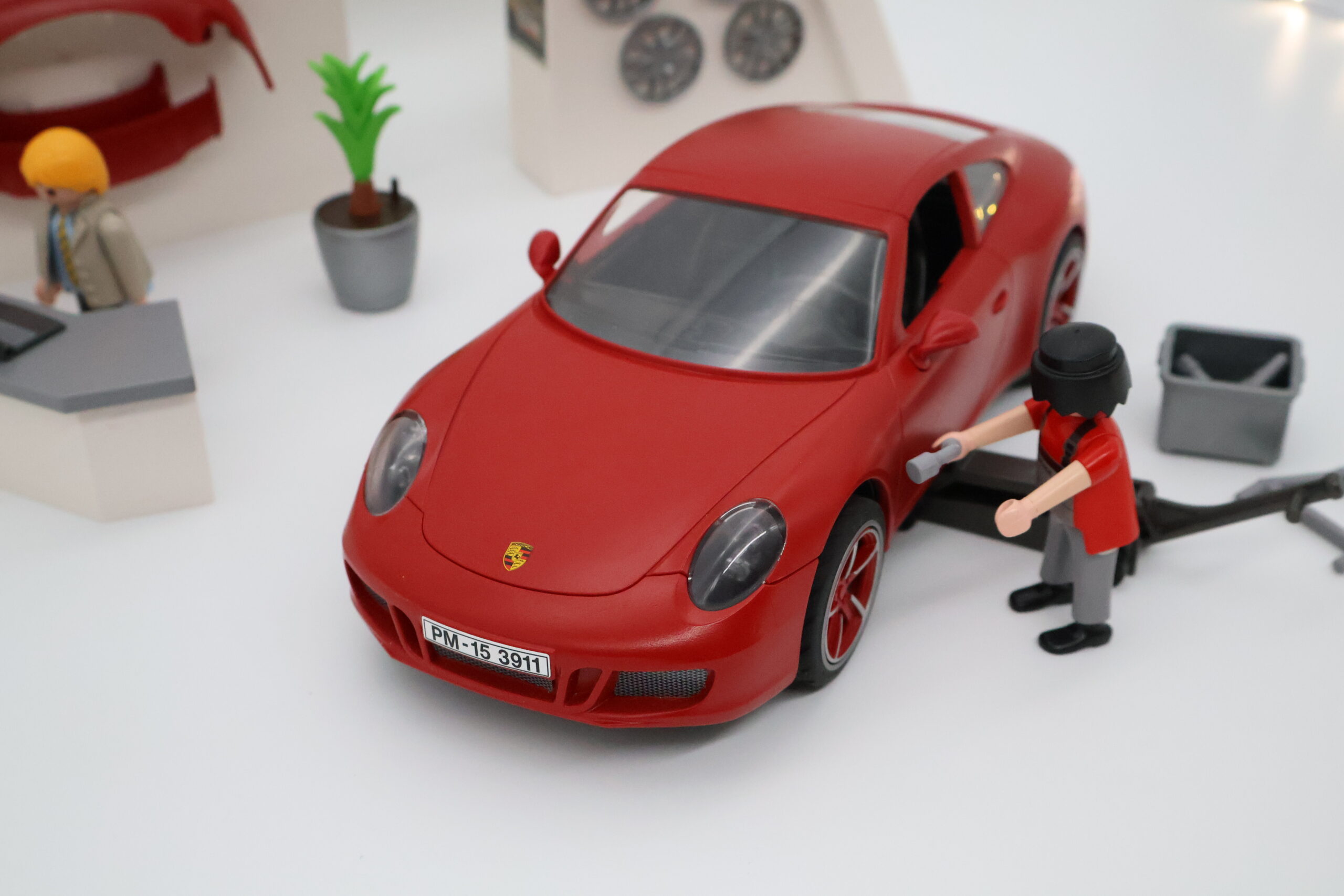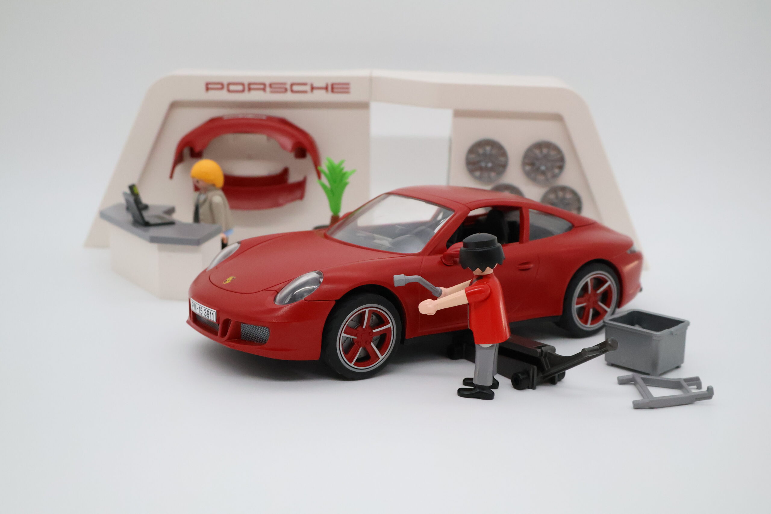 Comprend deux personnages et un atelier avec de nombreux accessoires. Les jantes, le spoiler et le pare-chocs sont amovibles. Avec phares et tableau de bord lumineux (nécessite 3 piles 1,5V AAA non fournies).